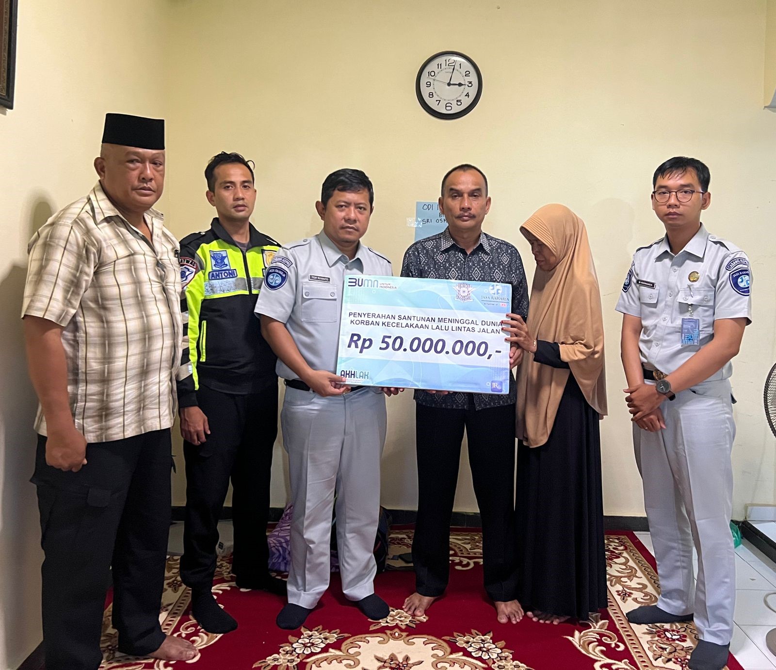 Santunan diserahkan secara simbolis oleh Toif Riyanto selaku Kepala Unit Operasional dan Humas PT Jasa Raharja Cabang Kepulauan Riau dan Viktor Hutahean selaku Kanit Laka Polresta Barelang kepada ahli waris dari korban meninggal dunia, di kediaman ahli waris korban (ayah kandung korban) di Bida Ayu, Mangsang Sei Beduk, Kota Batam pada hari Sabtu pagi (10/12)