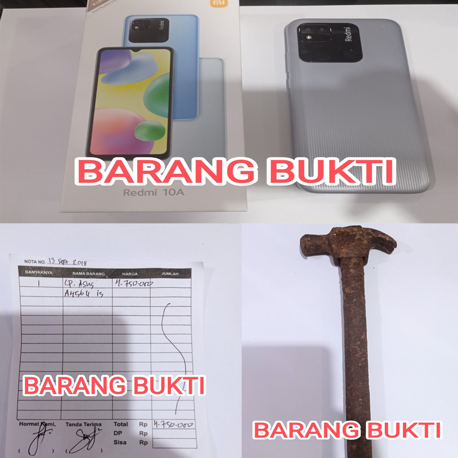 Adapun barang bukti yang diamankan antara lain 1 Unit Handphone merek Xiaomi Redmi 10A warna Chrome Silver, 1 buah kotak Handphone merek Xiaomi Redmi 10A, 1 buah Palu dengan kondisi berkarat dan 1 Lembar Nota pemebelian Laptop merek Asus.