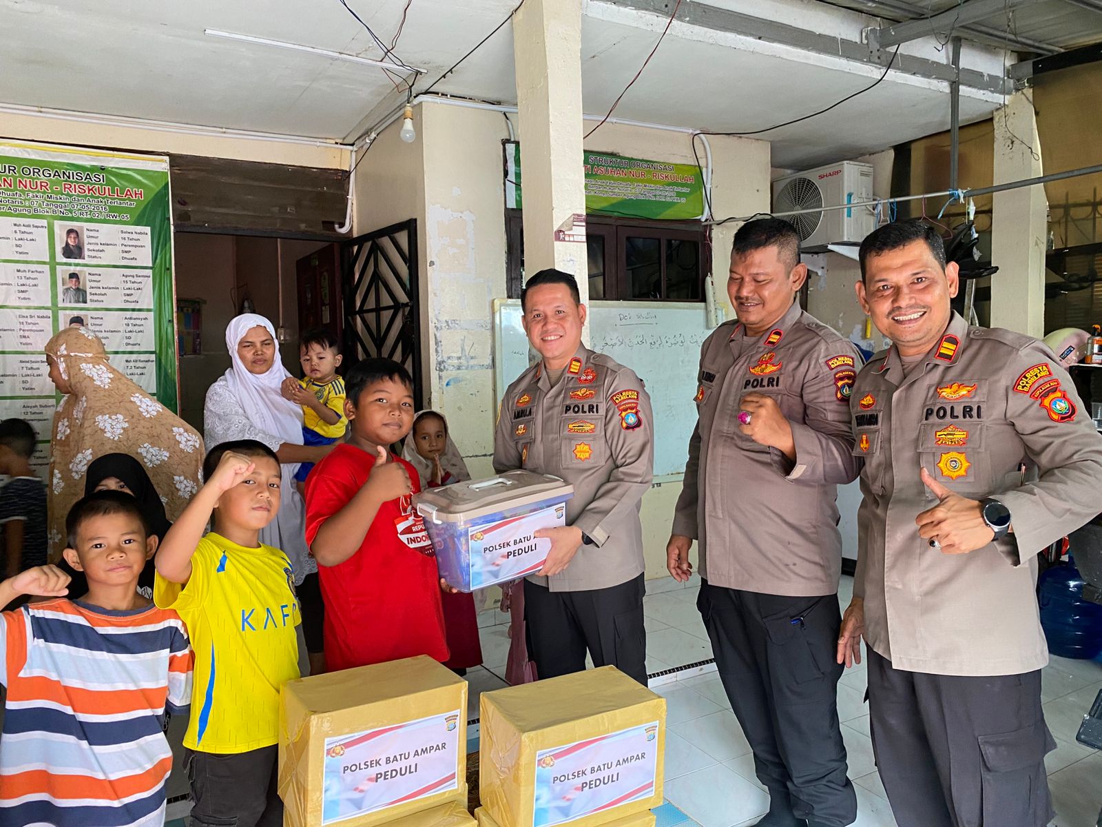 Sebagai bentuk kepedulian terhadap sesama, terutama anak-anak yatim dan kurang mampu, Polsek Batu Ampar menyalurkan bantuan sembako berupa mie instan, susu UHT, telur, sirup, gula, teh, dan biskuit kaleng merek Tanggo. Bantuan ini diberikan kepada 47 anak asuh yang terdiri dari 25 anak di Panti Asuhan Ridho Ilahi dan 22 anak di Panti Asuhan Nur Riskullah.