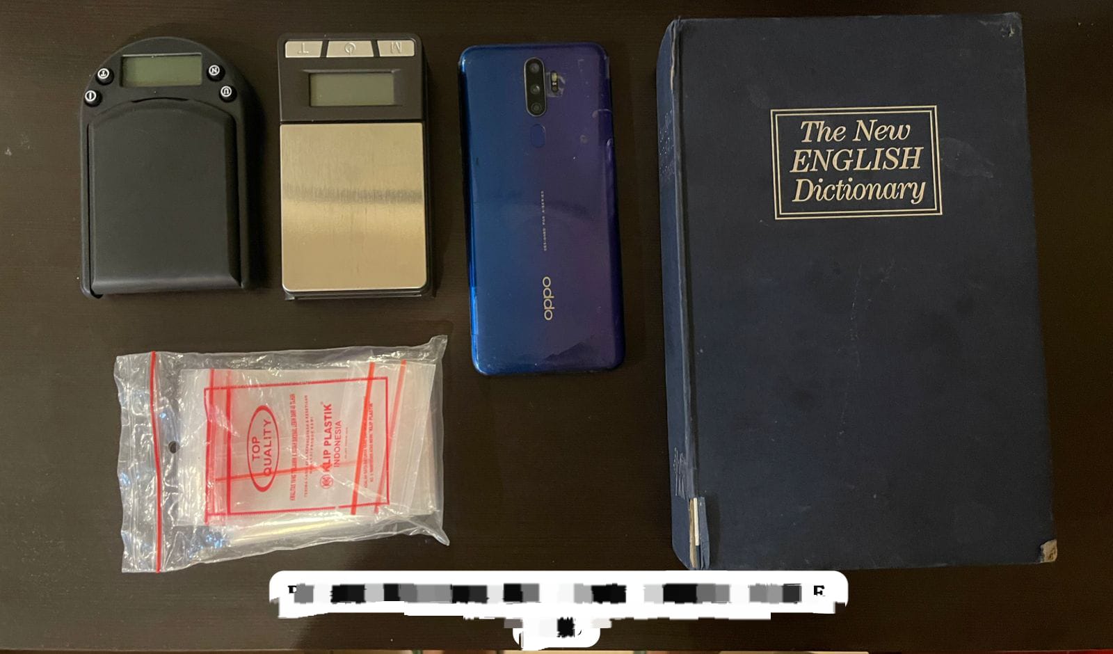Meski tidak ditemukan narkotika siap edar saat penangkapan, petugas menemukan alat pendukung berupa dua unit timbangan digital dan plastik bening kosong yang disembunyikan dalam kotak bertuliskan The New English Dictionary di kamar tersangka.