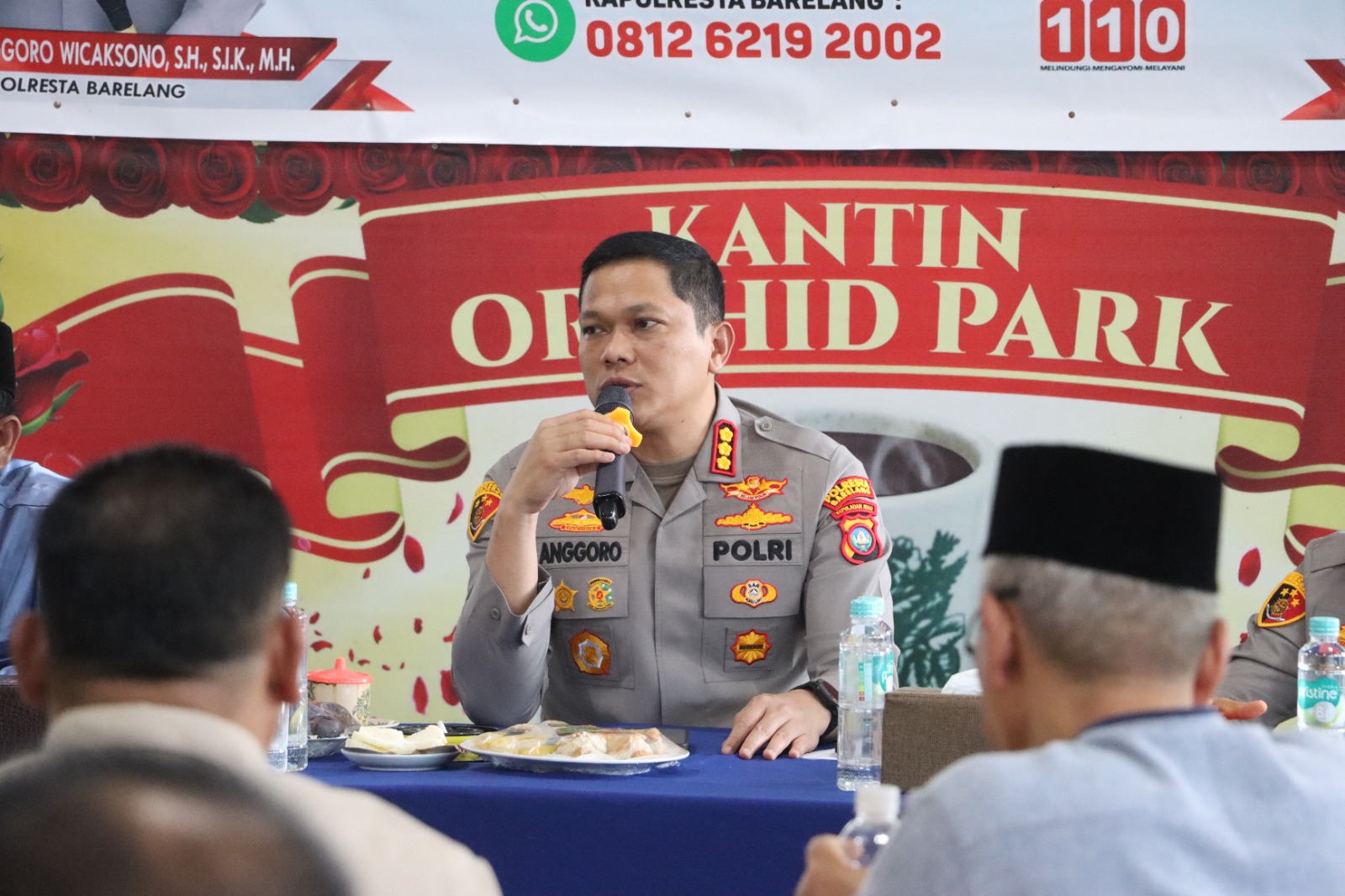 Kapolresta Barelang Kombes Pol. Anggoro Wicaksono berdialog langsung dengan warga saat kegiatan Jumat Curhat Kamtibmas di Pujasera Perumahan Orchid, Batam Kota, Jumat (24/4). Kegiatan ini menjadi wadah menyerap aspirasi masyarakat terkait keamanan dan ketertiban lingkungan.
