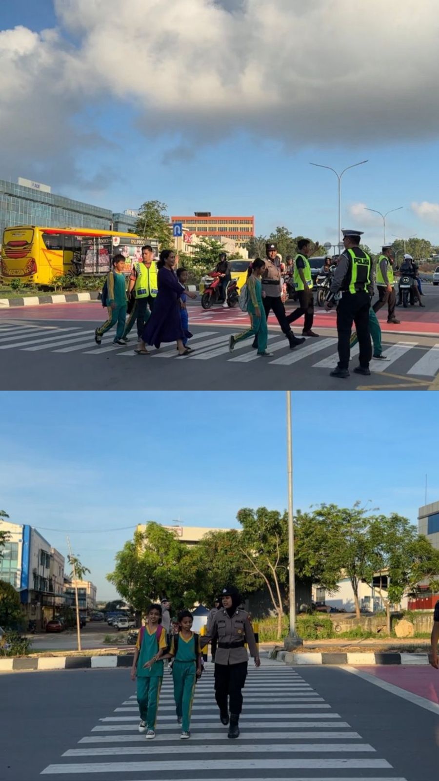 Kegiatan tersebut difokuskan pada pengaturan arus lalu lintas dan membantu pelajar menyeberang jalan guna memastikan keamanan dan keselamatan saat berangkat ke sekolah.